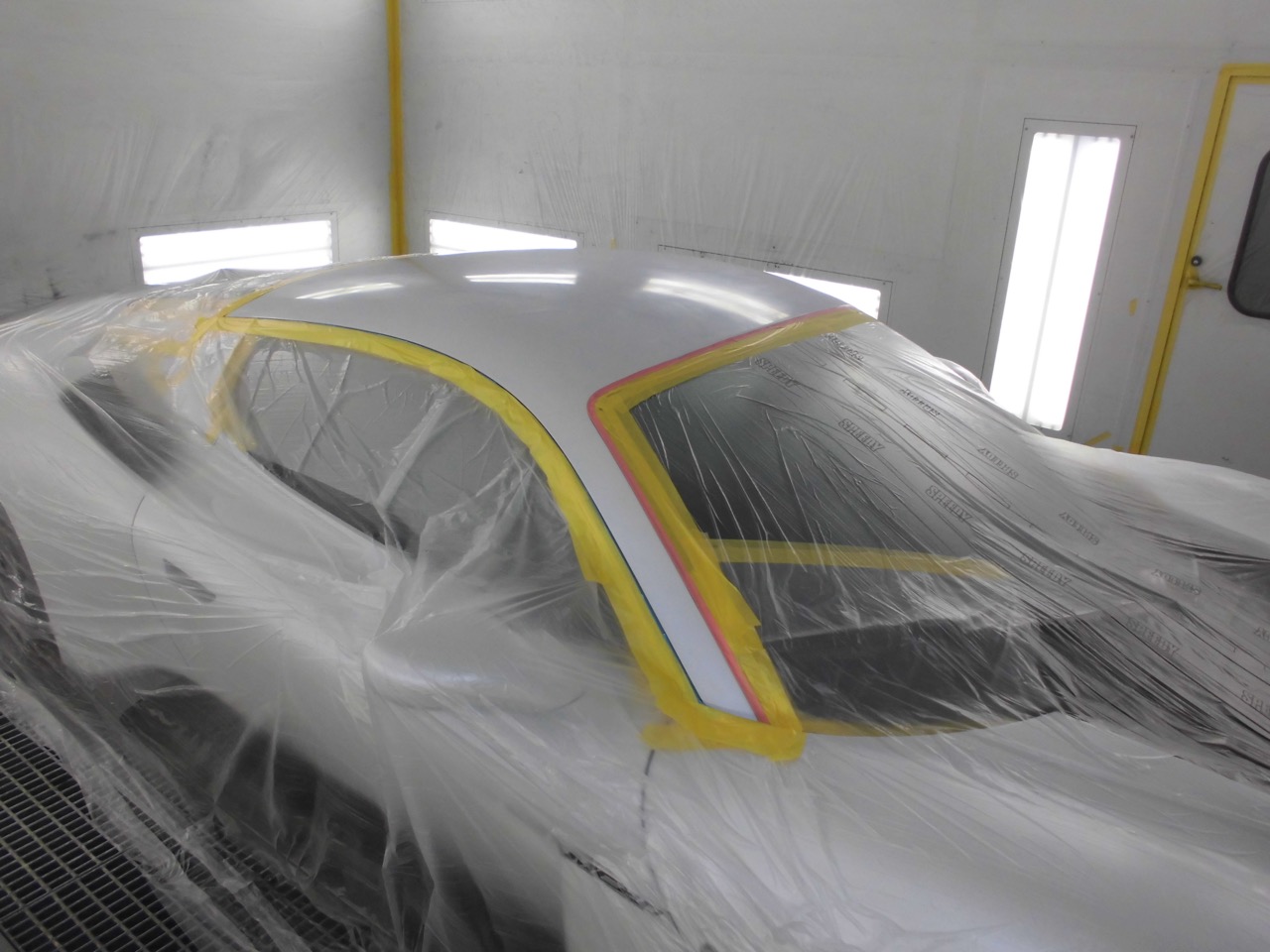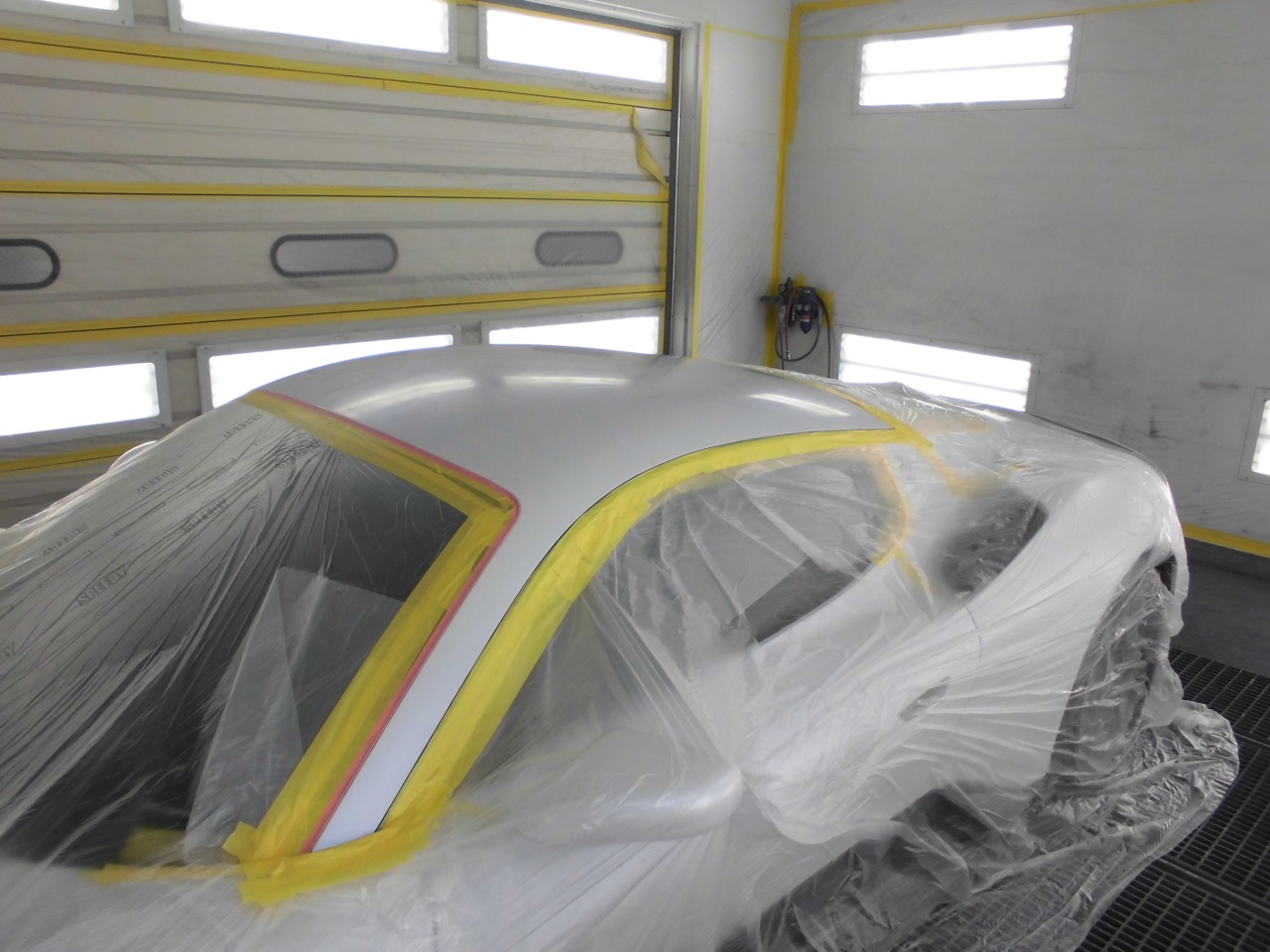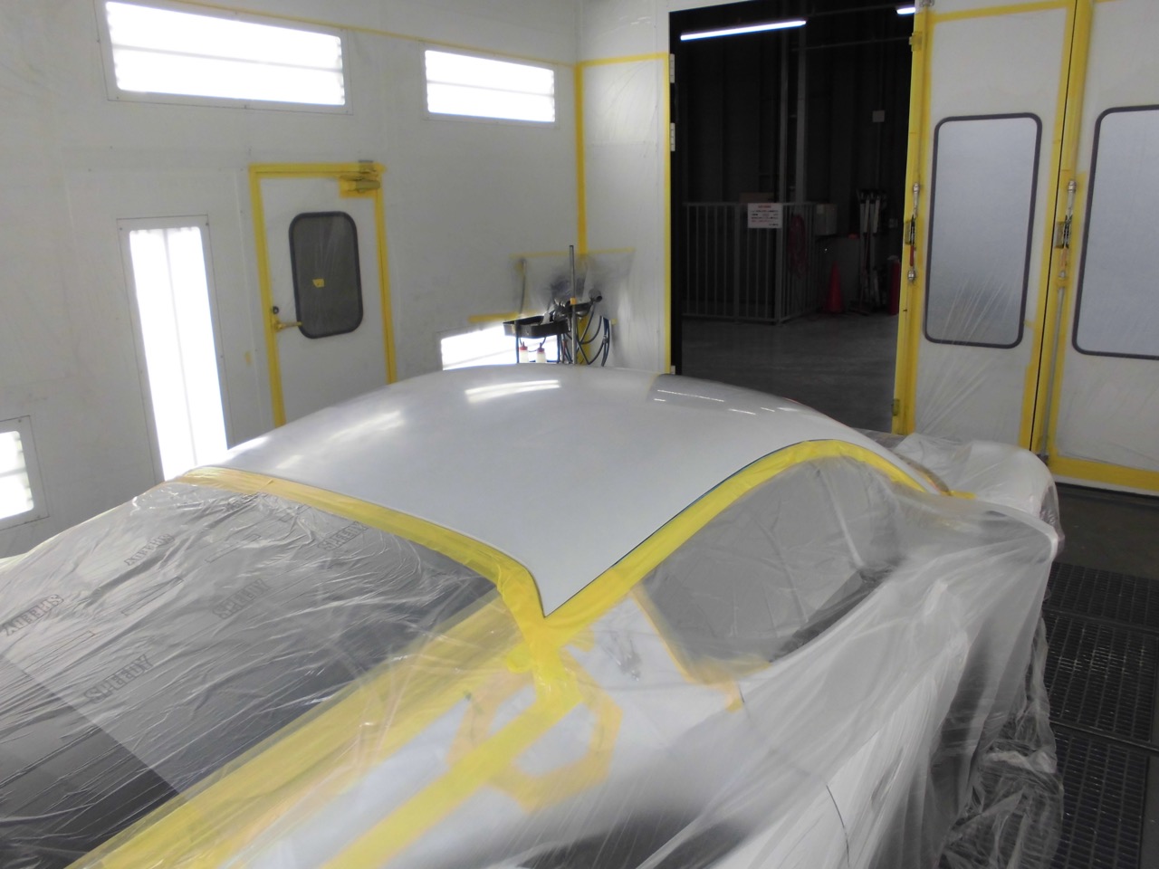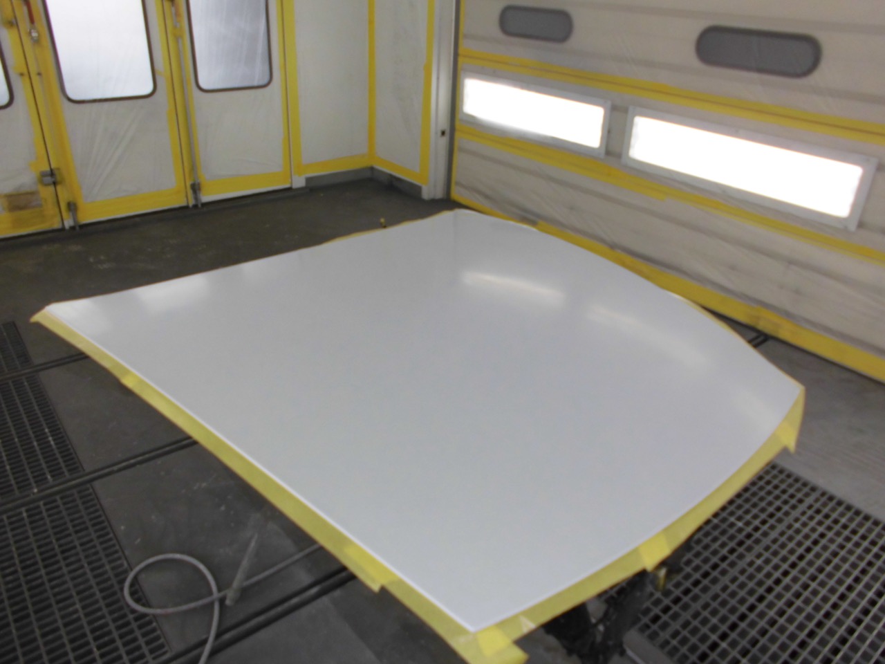 ゴミや埃の混入を防いだ塗装ブース内で、ボンネットとルーフの塗装作業を行います。