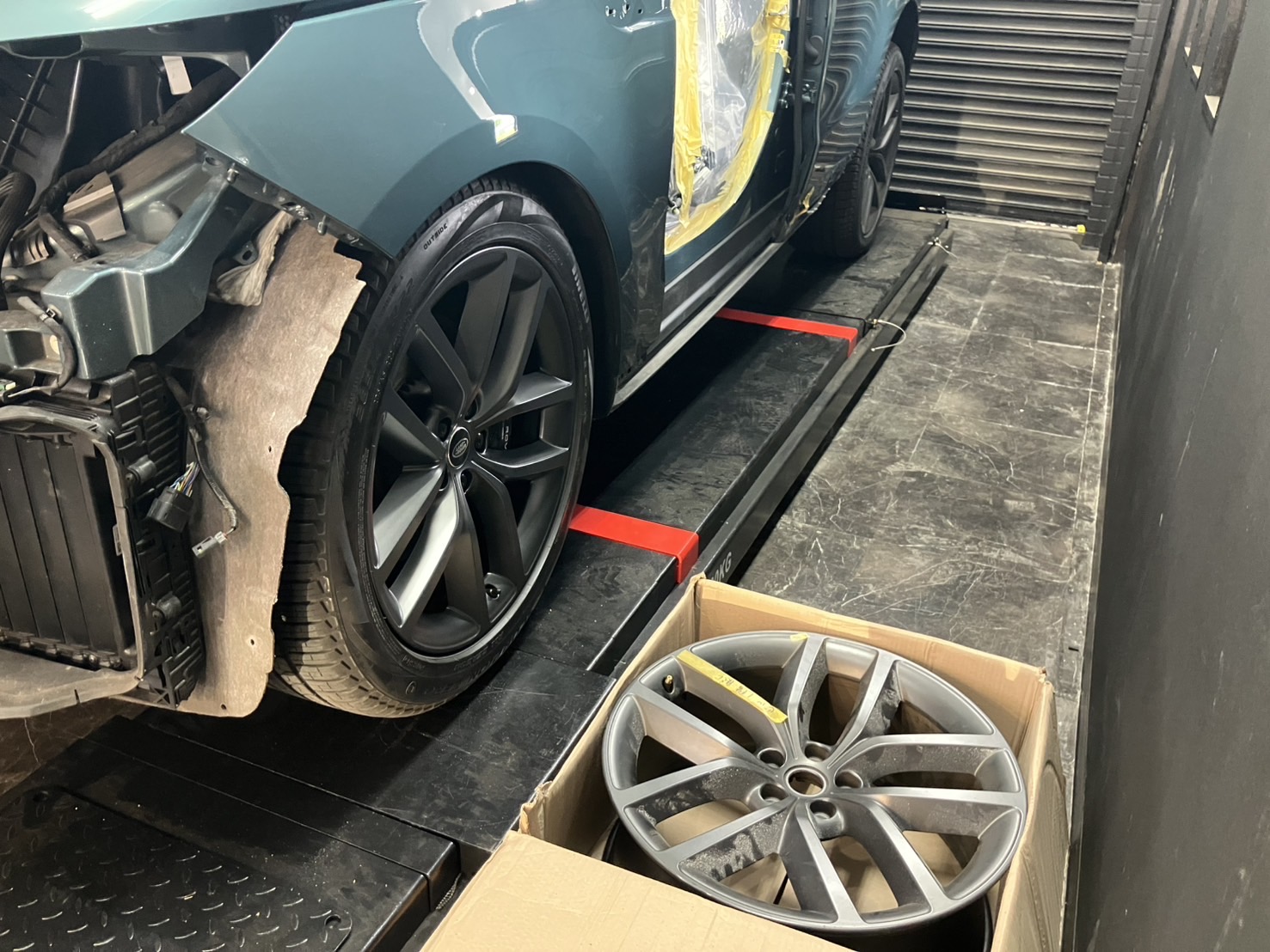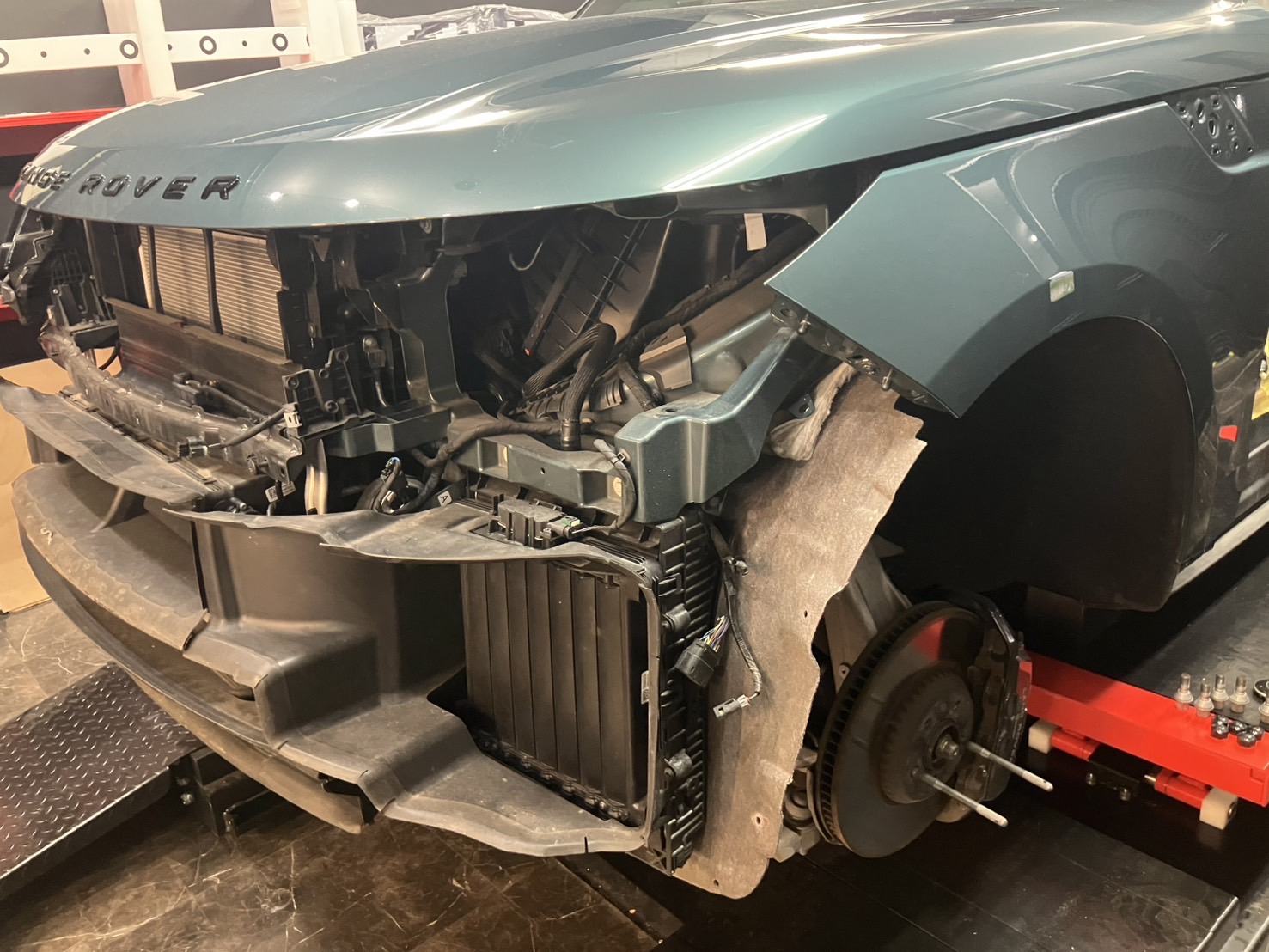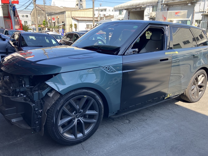 フロントバンパーやヘッドライト、周辺パネルを取り外し、新しいフロントドアへ交換作業を行います。